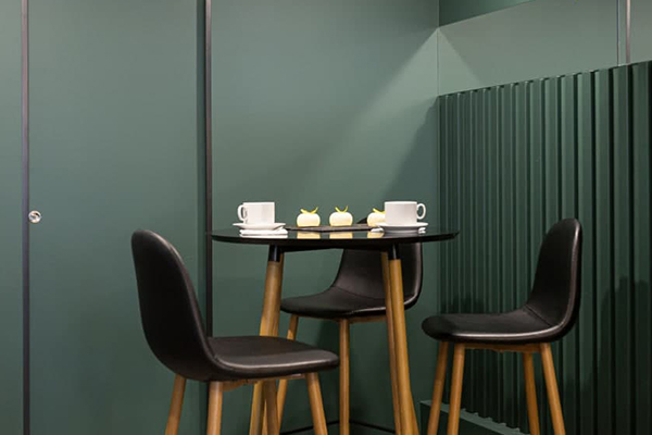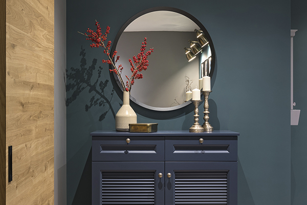 Для проекта «Haven» в ЖК Минск Мир Юлия выбрала довольно тёмный цвет стен, который стал прекрасным фоном для сочных оттенков мебели и декора. Такое решение удачно подчеркнуло оттенки зелёного, не перегружая небольшое помещение.